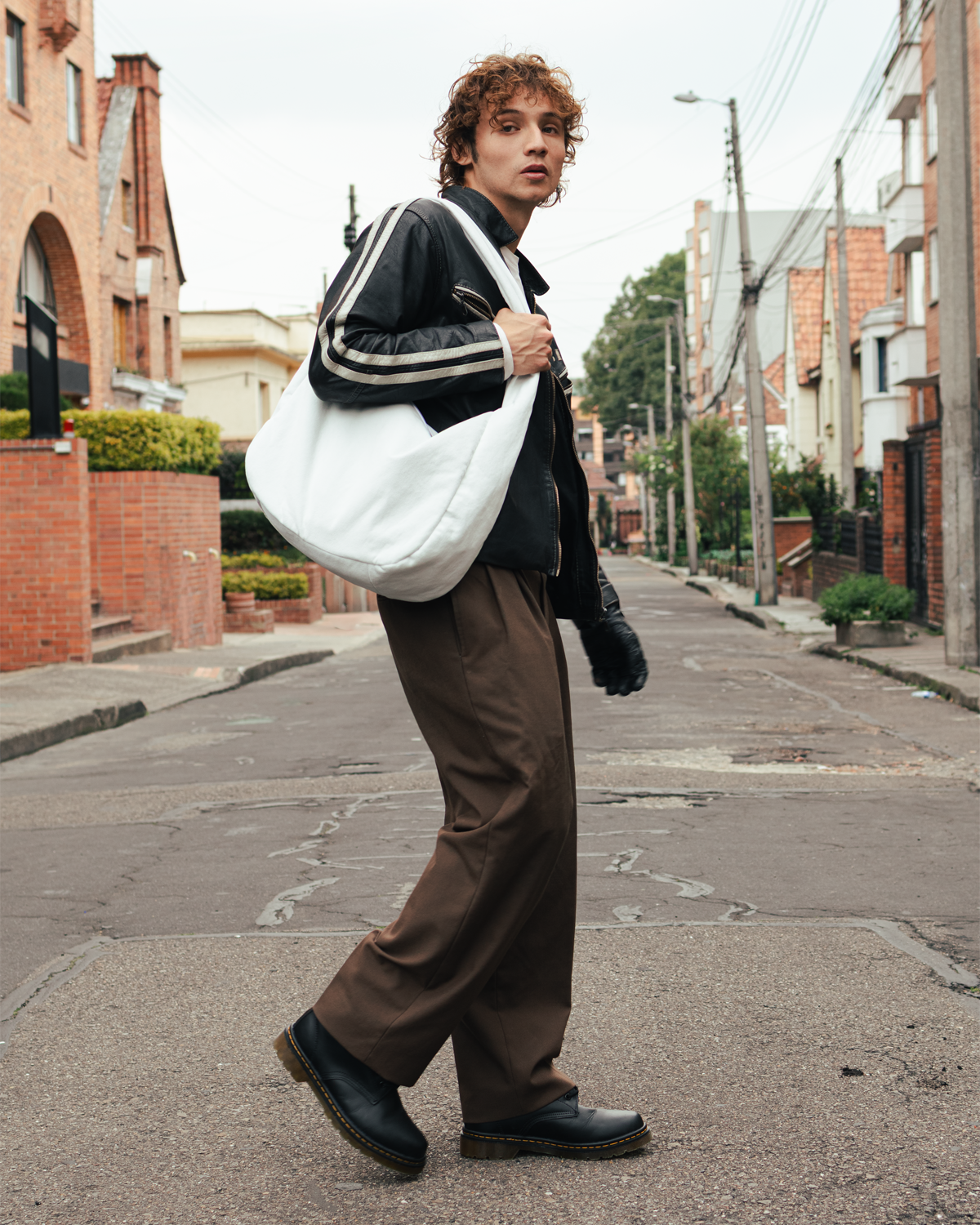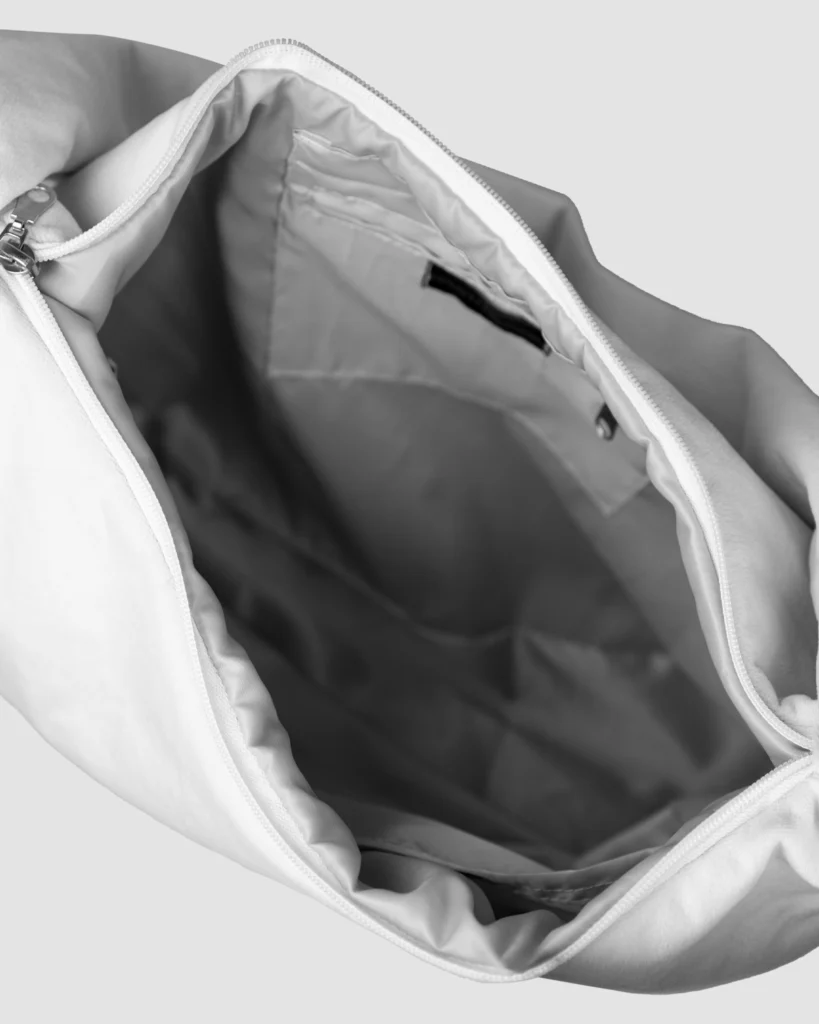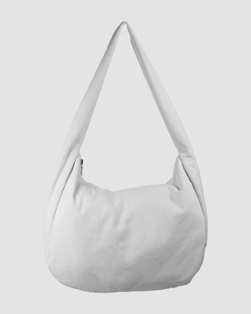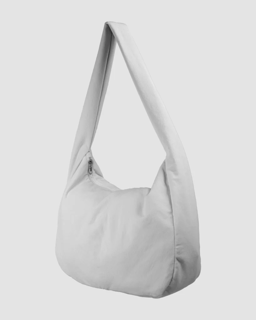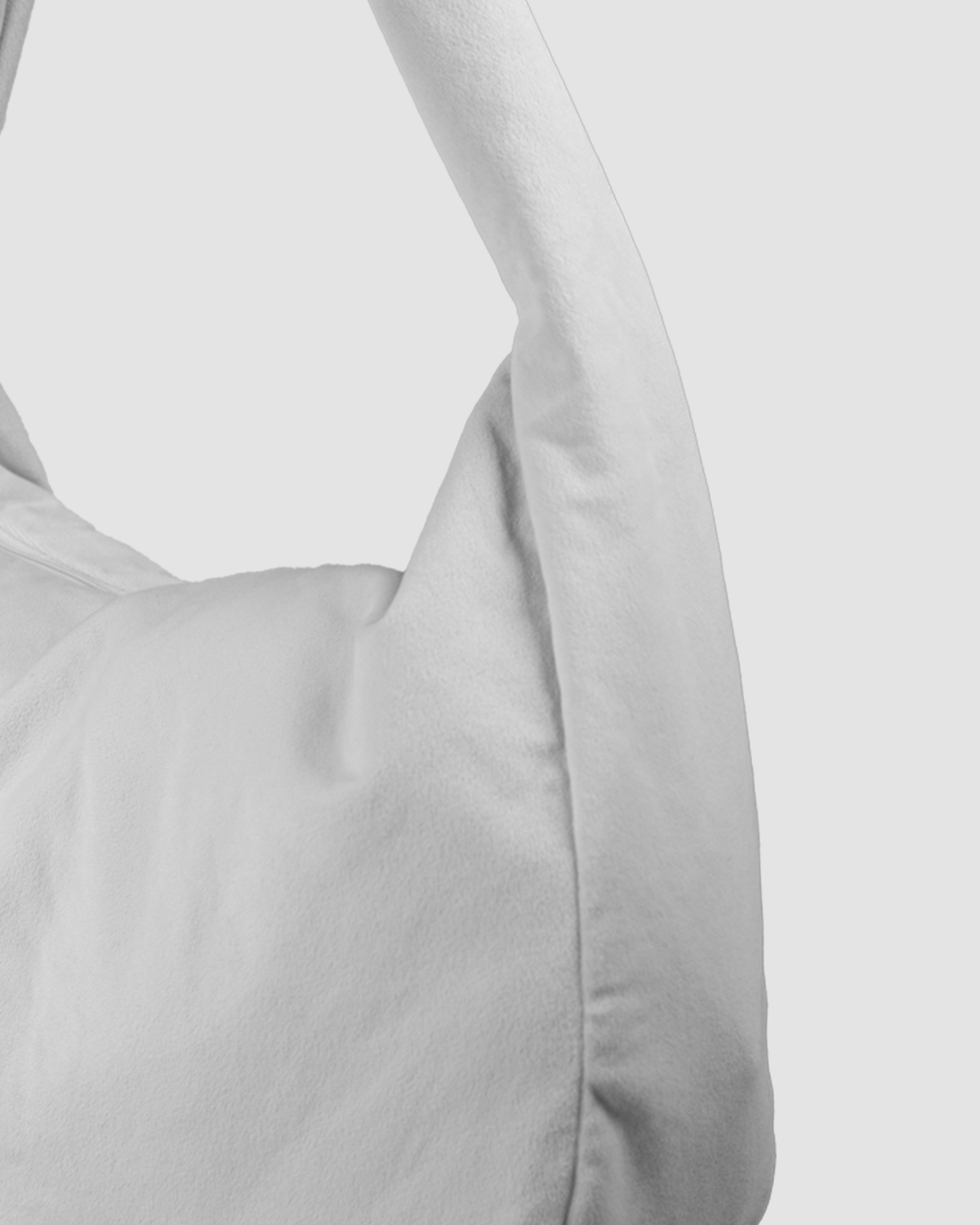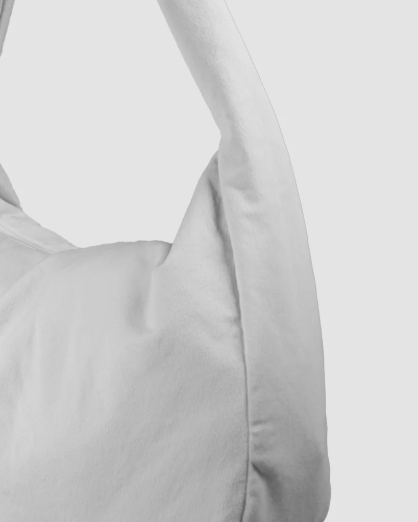 Hobo Bag color Blanca, hecha con tela de tapicería 100% poliéster, resistente a líquidos y pet-friendly. Espaciosa, duradera y perfecta para el día a día.