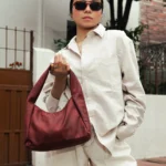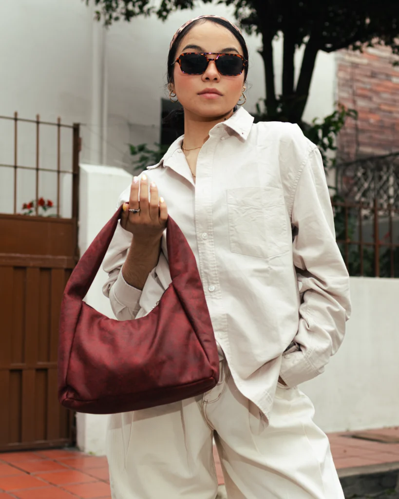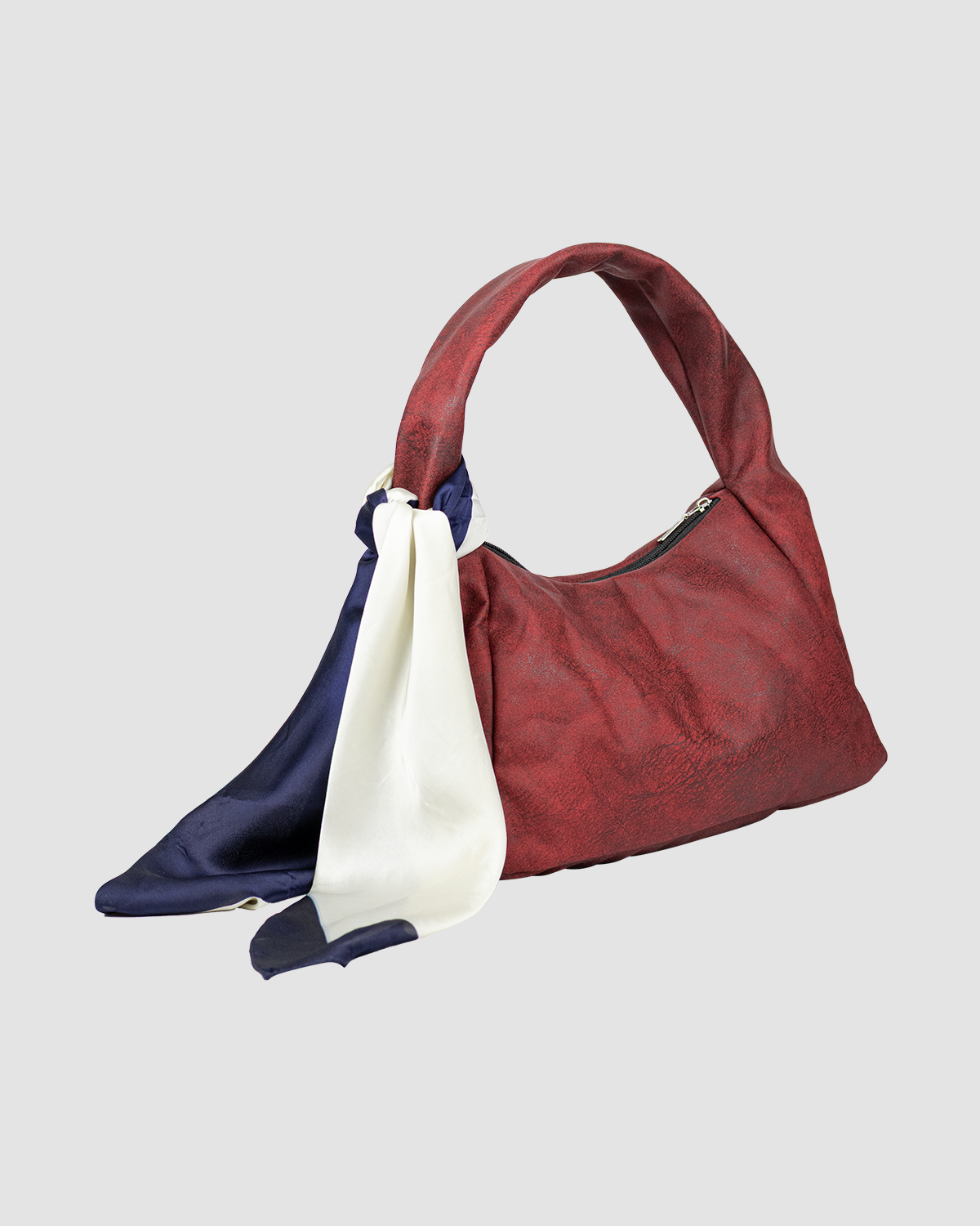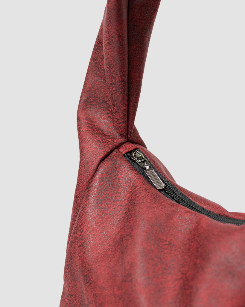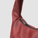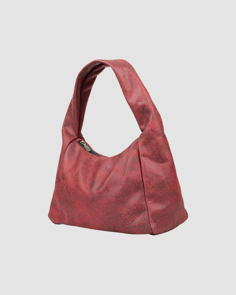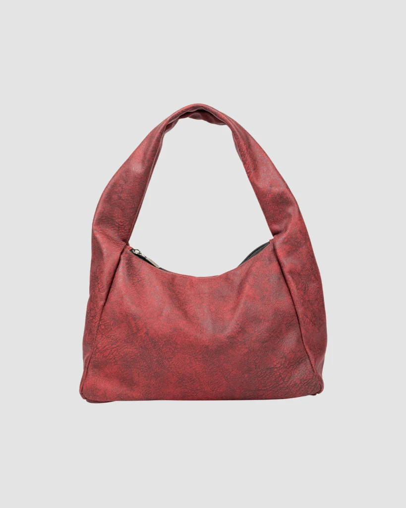 Hobo Bag Mini Granate, hecha en tela de tapicería 100% poliéster, resistente al agua y pet-friendly, cierre en cremallera, compacto y práctico.