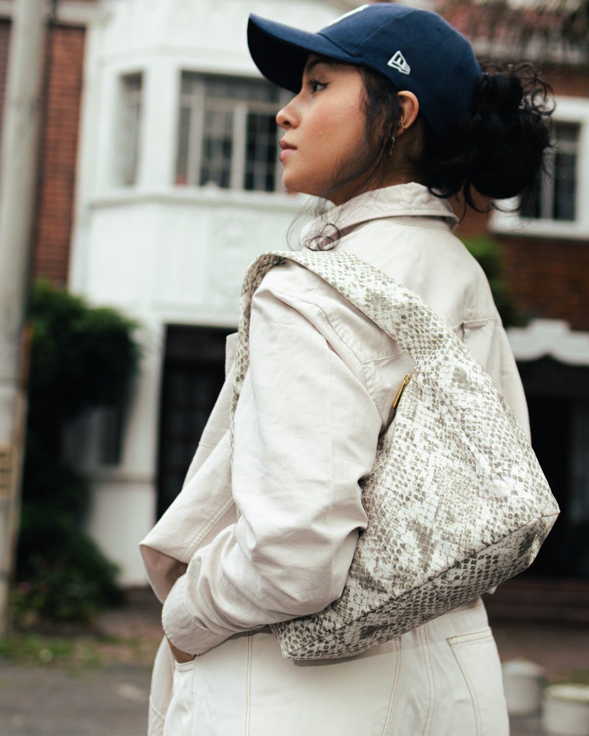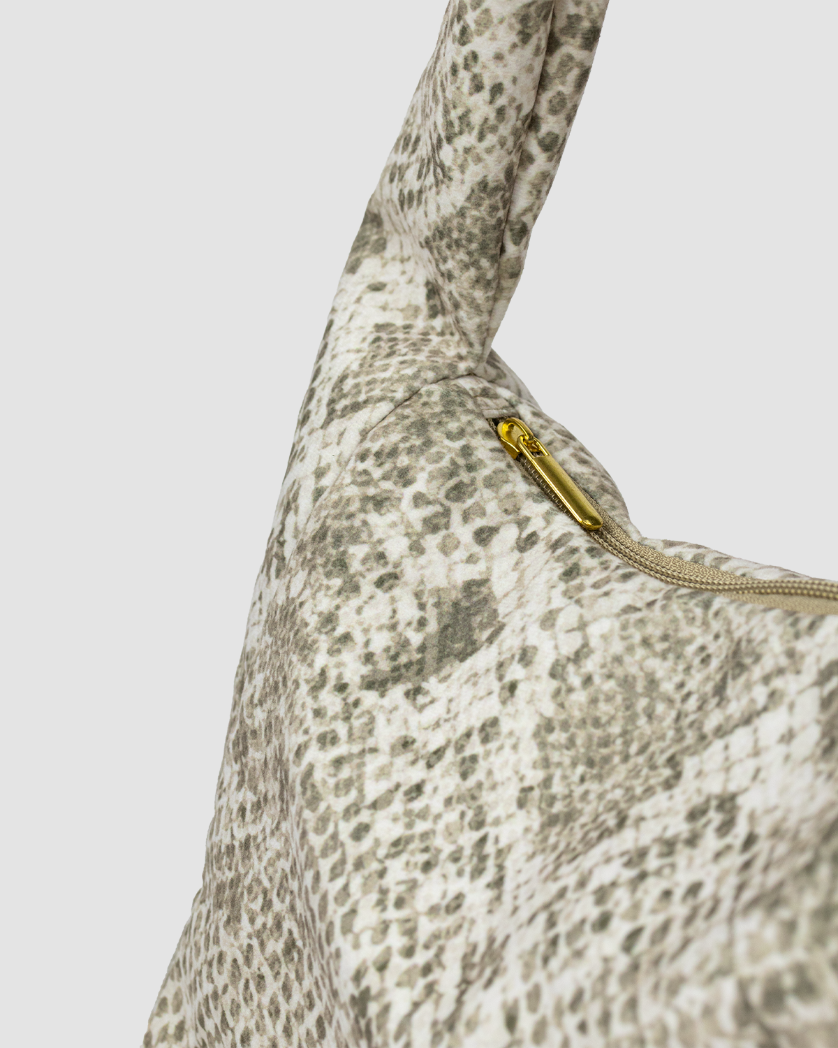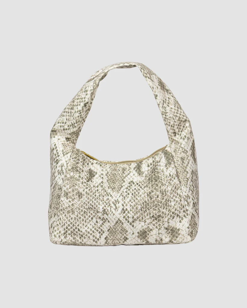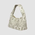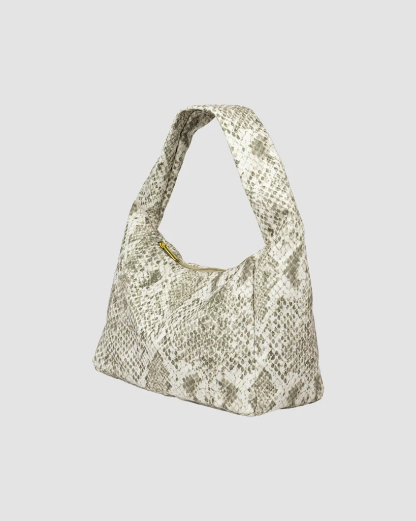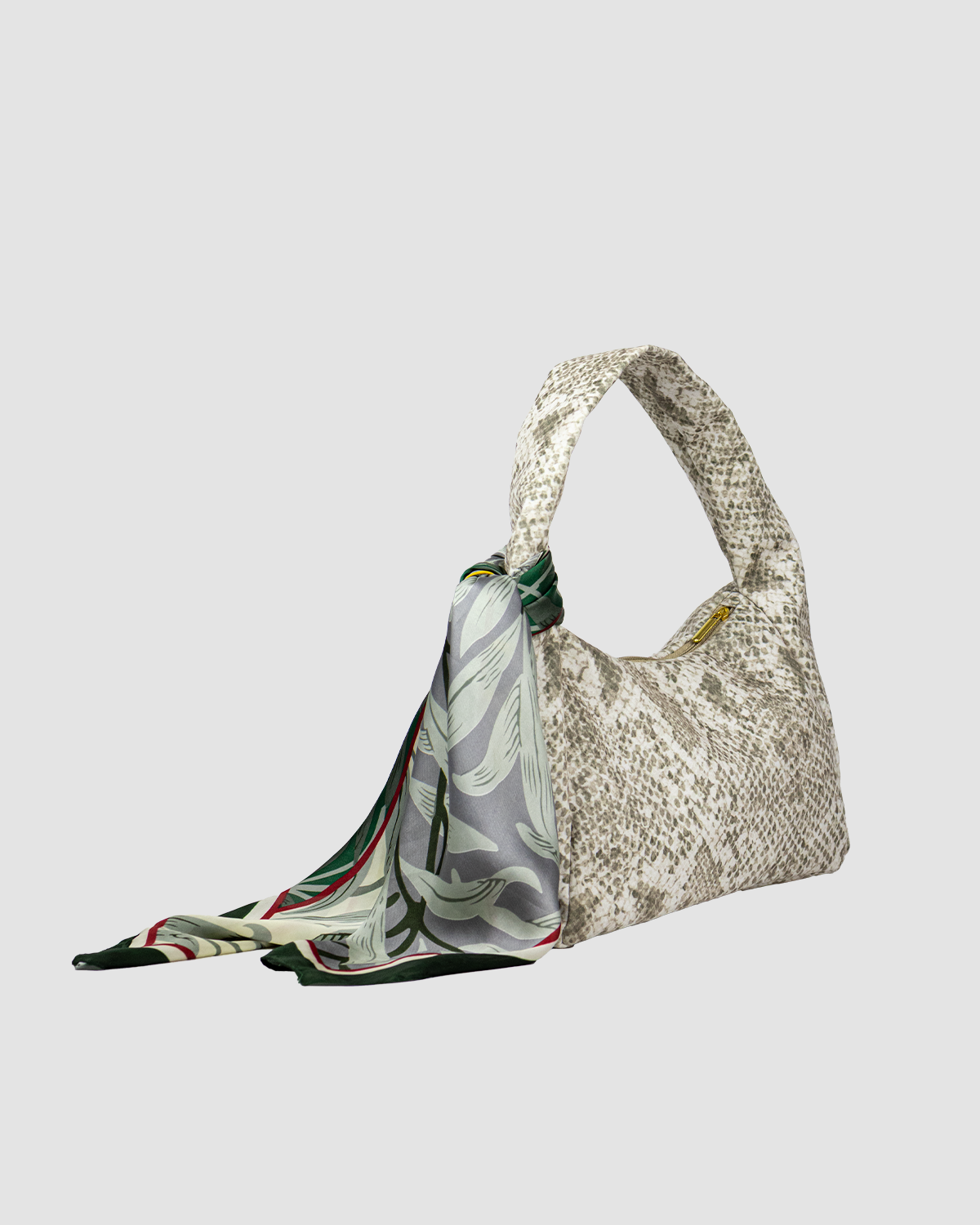 Hobo Bag Mini Snake, hecha en tela de tapicería 100% poliéster, resistente al agua y pet-friendly, cierre en cremallera, compacto y práctico.